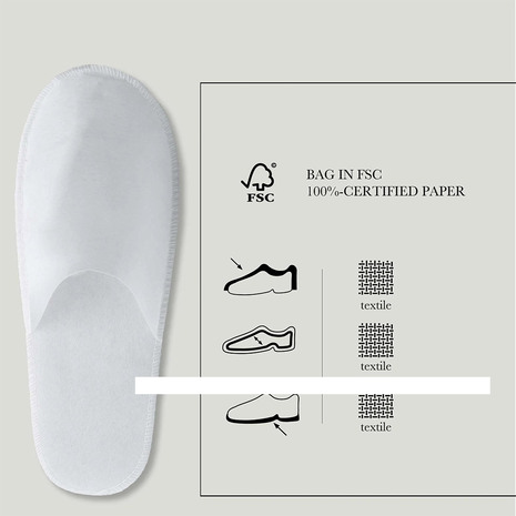 Copati beli, spredaj zaprti, hotelski, iz netkanega materiala, s tršim podplatom. V papirnati embalaži s 100 % FSC certifikatom. Dolžina copata: 28,5 cm.