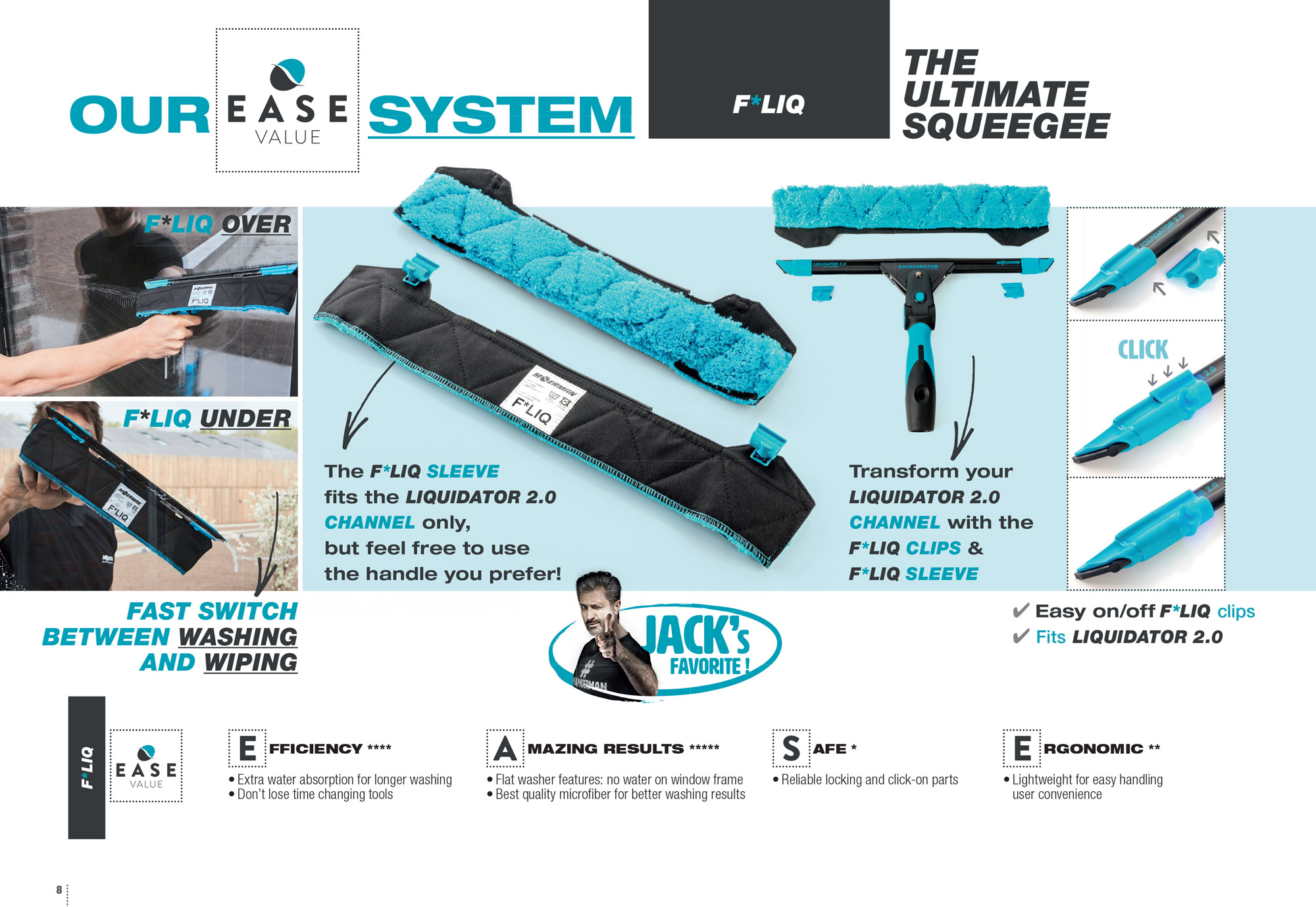 F*LIQ je inovativen sistem integriranega pomivanja stekel, idealen za čiščenje na višinah. Z namestitvijo pomivalne krpe neposredno na brisalec omogočimo preklop med obema funkcijama s kratkim zamahom roke. Krpa se lahko namesti iz zgornje ali spodnje strani glede na način dela: pri delu s kratkim ročajem se krpa običajno obesi s spodnje strani, za delo z daljšimi teleskopskimi ročaji pa se priporoča obešanje krpe preko brisalca.