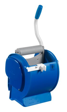 - Ožemalnik z valjem in brez dna, ki omogoča izpiranje in ožemanje ploščate krpe neposredno znotraj ožemalnika v vedro, kar zmanjša stroške, delovni čas in neprijetno kapljanje po tleh.